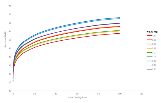 The hardness associated with the variation of magnesium content in the Al 6061 alloy, as a function of the initial solidification cooling rate, as presented herein, upon solidifying from a temperature of 700 °C.