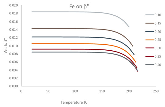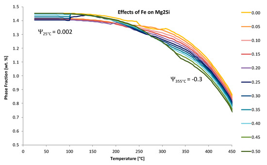Another example of the differentiation between positive and negative EIF’s is given in Figure 19. Figure 19 depicts the way in which the equilibrium phase fraction, or the fractional, weight percent of Mg2Si, as a function of the temperature as well as the weight percent of iron relative to the alloyed aluminum system under consideration. Clearly, the respective EIF calculated at a temperature of 25 °C for Fe maintained a value that reveals a far less deleterious influence of Fe on Mg2Si than that of Fe at 355 °C.