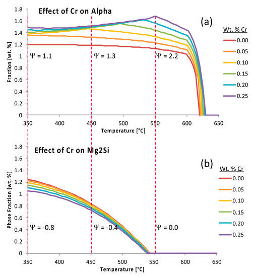 (a) The fractional weight percent of alpha as a function of temperature and the weight percent of chromium relative to the Al 6061 system. (b) The effect of chromium on the phase fraction of Mg2Si as a function of said alloying element and temperature.