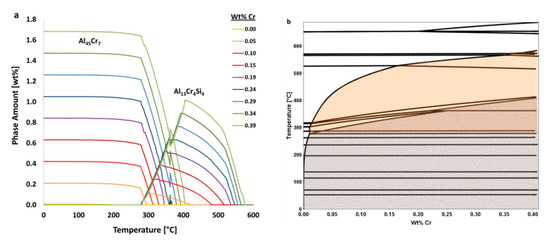 Analogous analysis exemplifies an additional use of s for phases; that is, the reduction or even removal of deleterious phases in a material, which can occur by way of adding elements with a negative in relation to said phase. Conversely, elements with a positive , in such a scenario, could be used to increase the number of desired phases. To depict the physical representation of , the utilization of the calculated isopleth for the average composition of Al 6061, as a function of chromium content, is shown in Figure 18. The orange and gray shaded regions in Figure 18b represent ranges where Al13Cr4Si4 and Al45Cr7 are respectively present at equilibrium. Between approximately 300 and 400 °C, Al13Cr4Si4 converts to Al45Cr7 upon cooling. Furthermore, the solubility of chromium in the FCC matrix increases with temperature and accounts for the balance of chromium in the system.