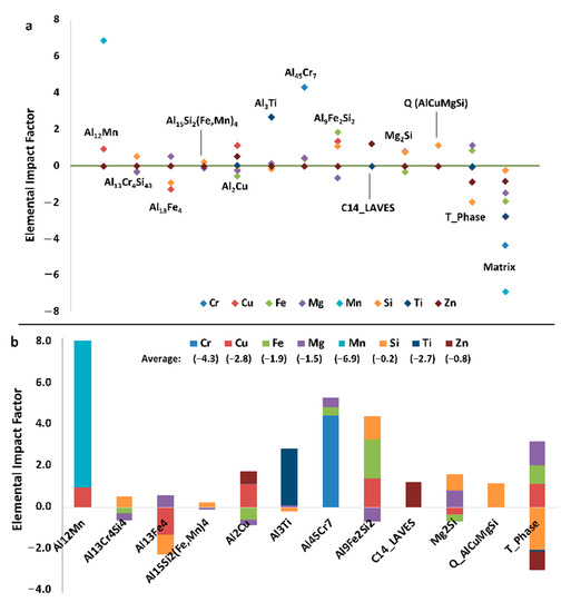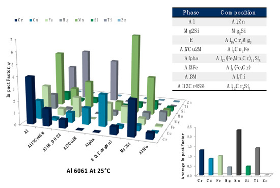 Relative EIFs can also be a valuable method to study the effects of composition and/or temperature variation. Figure 20a contains the EIFs for the matrix and secondary phases for each element in Al 6061 at 25 °C. Here it is clearly depicted which elements influence, positively or negatively, the amount of equilibrium phases present. Some of these results are intuitive: the addition of magnesium and silicon both have positive influences on the formation of Mg2Si. This analysis also allows for the detection of elemental influences that are arguably much less obvious. For example, copper and iron have a negative effect on the amount of the Mg2Si phase and magnesium has a negative effect on the Al9Fe2Si2 phase despite none of those elements being present in the standard stoichiometries associated with those respective phases. Similarly, manganese has a positive effect on Al45Cr7 and copper has a positive effect on Al12Mn. It is evident that the addition of any of the elements, with the exception of aluminum, decreases the amount of the matrix phase, and therefore increases the number of secondary phases. The Mg2Si phase is also more easily influenced by compositional changes than the Al3Fe phase and therefore may require more significant compositional changes to be mitigated or created in accordance with the resultant findings from EIF-based analysis.