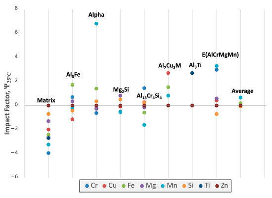 Consistent with the rationale associated with Figure 23, Figure 24 presents a similar analysis of s and average s for the same pairing of alloying elements and equilibrium phases found in Figure 23. However, unlike Figure 23, which dealt with a temperature in the artificial heat-treating or thermal processing temperature regime, Figure 24 entertains the temperature associated with the known phenomena of natural aging in lightweight aluminum alloys. Once again, and in terms of the EIF approach/analysis, under equilibrium conditions, one may note that manganese, titanium and chromium maintained the greatest average s associated with equilibrium phases at 25 °C, whereas zinc, magnesium and silicon maintained the least impactful average s. The table embedded in Figure 24 was provided to highlight the actual elements that could be associated with a given nominal phase, in a substitutional manner, even if a given phase’s defined stoichiometric ratios do not explicitly include other prospective elements present.