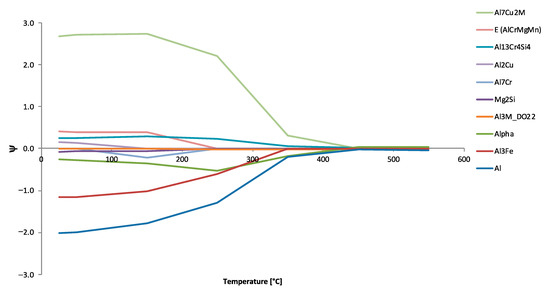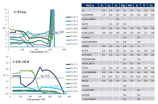 The s associated with each of the alloying elements for the matrix aluminum FCC matrix or base phase and the Al13Cr4Si4 phase as a function of temperature. At the same time, a table presenting the average s computed for the particular phase–element combinations studied over the range of temperatures considered in silico is presented in Figure 25 as well.