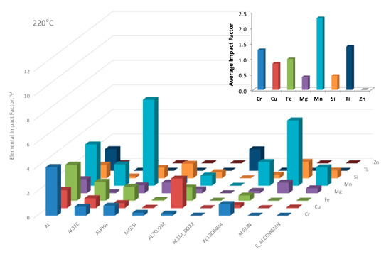 Having taken a more robust look into the s associated with copper as an alloying element, we may once again turn towards a multifaceted presentation of s associated with given combinations of alloying elements in the Al 6061 system of interest and the equilibrium phases predicted at 220 °C, which reflects the heat-treatable artificial aging temperature regime for the aluminum alloy considered in large part herein. Said assessment was presented in Figure 23. Additional analysis of the EIFs concerns the average s associated with each element and phase studied as part of Figure 23 at 220 °C too. This plot was embedded in the upper right corner of Figure 23. As a result, one may note that manganese, titanium and chromium maintained the greatest average s associated with equilibrium phases at 220 °C, whereas zinc, magnesium and silicon maintained the least impactful average s.