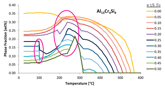 The phase fraction of Al13Cr4Si4 as a function of temperature and iron content for demonstrative purposes.