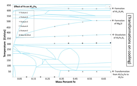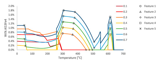 As was just alluded to it is important to understand the physical meaning behind the behavior of the phases shown in Figure 26, for example. One example of such behavior is observed in the phase fraction diagram in Figure 27 for the Al13Fe4 intermetallic phase fraction versus temperature curves as a function of varied iron contents. The abrupt changes in the phase fractions can be correlated to phase boundaries shown in Figure 28. The phase changes corresponding to these changes are given as follows: Feature 1 in Figure 27 and Figure 28 corresponds with the maximum amount of Mg2Si that can form at 300 °C; Feature 2 corresponds with the dissolution of Al9Fe2Si2 at 350 °C; Feature 3 corresponds with the formation of Mg2Si between 450 and 500 °C; Feature 4 corresponds with the formation of Al15Si2M4 at 600 °C; and Feature 5 corresponds with the transformation from Al7Cu2Fe to Al2Cu.