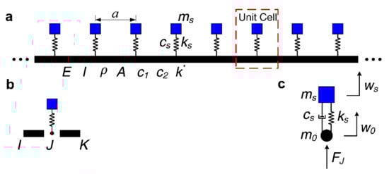 As the coupling system of spring-mass oscillator and the beam node in the infinite long periodic oscillator coupled damping beam unit cell plotted in Figure 1c, the relationships of the displacement continuity and the force equilibrium at the internal node J of the unit cell can be expressed as follows: