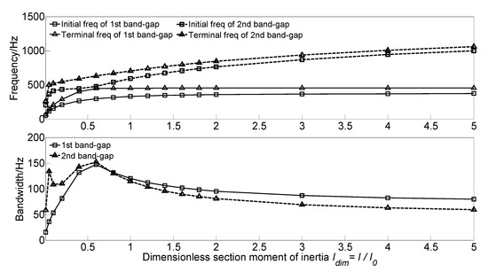 It can be found that, with the increase of the dimensionless section moment of inertia Idim from 0.01 to 5.0, the initial frequencies and terminal frequencies of the two band gaps move up to the high-frequency region. For the first band gap, the initial frequency gradually increases from 50 to 374.9 Hz. the terminal frequency increase from 66.3 to 446.5 Hz first when the dimensionless section moment of inertia Idim in the range 0.01~0.6, and after that remains unchanged at about 450 Hz. Thus, the bandwidth increases from 15.5 Hz to the maximum value of 147.4 Hz when the dimensionless section moment of inertia Idim = 0.6, and then decreases to 80 Hz. For the second band gap, the initial frequency and terminal frequency significantly increase when the dimensionless section moment of inertia Idim in the range 0.01~0.1, which increases from 205.3 to 412.5 Hz and 263.9 to 520.9 Hz, respectively. Furthermore, after that, they gradually increase to 1000.5 and 1059.7 Hz. Thus, the bandwidth increases to 133.7 Hz first when the dimensionless section moment of inertia Idim = 0.05 and then decreases to 108.4; after that, the bandwidth increases to the maximum value of 152.4 Hz and gradually decreases to 59 Hz at last. This phenomenon is because the flexural wave vibration band gaps are caused by the coupling effect between the flexural wave vibration of the homogeneous straight damping beam and the Bragg scattering of the periodic oscillator. With the increase of the dimensionless section moment of inertia Idim, the homogeneous straight damping beam’s bending stiffness enhances, increasing the eigenfrequencies.
