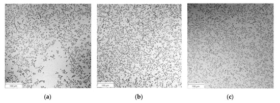 Recently, there has been considerable interest in improving the wear properties of machine parts’ working surfaces made from ductile cast iron (DCI) using laser surface treatment methods [1,2,3,4,5,6,7]. A highly effective approach to enhance the wear properties of metallic substrates is the formation of metal matrix composite (MMC) surface layers via laser alloying (LA) [8,9,10]. The wear performance of MMC materials is strongly affected by the morphology, fraction, and types of reinforcing particles, as well as the microstructure of the matrix [11,12,13]. Thus, the processing conditions and the chemical composition of the alloying material are extremely important to obtain the desired wear properties [14]. Depending on the chemistry of the alloying material, LA can produce MMC surface layers on cast iron substrates using both ex-situ and in situ routes [15,16,17]. The in situ MMCs offer the advantage of stronger interfacial bonding between reinforcements and matrix materials than ex-situ MMCs. Moreover, the in situ synthesized reinforcing phases exhibit higher chemical and thermal stability (long-term stability) [18,19]. High C contents in cast iron substrates provide excellent conditions for the in situ formation of MMC surface layers via LA, with elements that tend to form carbides. Several studies on the LA of cast iron substrates have focused on the in situ synthesis of TiC-reinforced layers (TRLs) by introducing Ti into the molten pool [16,20,21,22,23,24,25,26]. From the point of view of the wear properties, the microstructure of the synthesized TRLs should contain a martensitic matrix with homogeneously-dispersed TiC precipitates [24,26]. Moreover, published data on the wear performance of Fe-based MMCs reinforced with TiC phase suggest a significant increase in the wear resistance of TRLs with increasing the TiC fraction [24,26,27,28,29]. However, reported works have shown that during the in situ synthesis of TRLs on cast iron substrates via LA, it is difficult to maintain a homogeneous dispersion of the reinforcing phase upon increasing the Ti concentration in the melt [23]. As a consequence, control over the fraction and growth morphology of the TiC particles, and also the phase composition of the matrix, is highly limited.