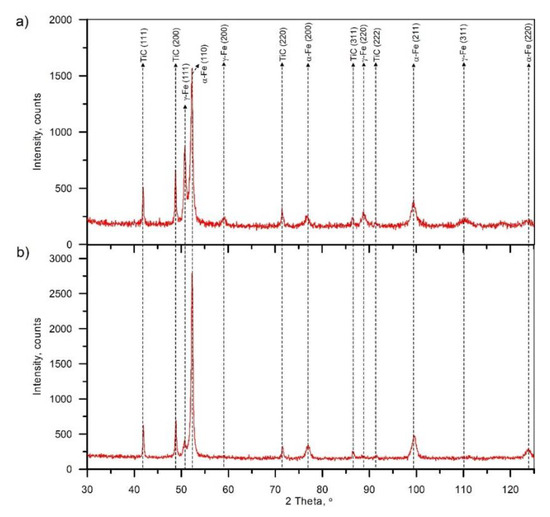 The micrograph analysis showed that the TRC and TRM exhibit a highly uniform distribution of TiC precipitates throughout the matrix and have similar fractions of about 21 vol%. This TiC fraction is close to that predicted by the thermodynamic calculations for the processed DCI substrate [24,25]. As a result, both the TRC and TRM contained minor fractions of the cementite phase (~2 vol%). Moreover, in contrast to the TRLs formed with pure Ti [25], there is no evidence of graphitization in the heat-affected zone (HAZ) between consecutive beads in SALs (Figure 5b and Figure 6d). As can be seen from Figure 5c and Figure 6c, the obtained TRC and TRM compositions also led to the formation of fine eutectic precipitates of the TiC phase with a plate-like morphology.