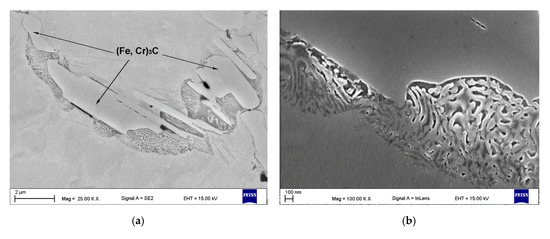 The typical eutectic-like structure formed during the last stages of solidification in TRM is presented in Figure 9. The fraction of these eutectic regions in the layer was estimated to be 1.9 ± 0.6 vol%. As in the case of (Fe, Cr)3C phase in TRC, the XRD did not detect the presence of these eutectic precipitates. However, considering the morphology of the above eutectic-like structure and the chemistry of the layer, one can assume that it contained mainly the cementite phase.