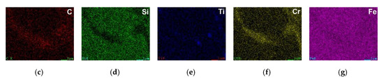 (a,b) SEM micrographs taken from the mid-section of the TRC (Table 3) showing eutectic-like structures due to the last solidification stages, (b) detail from (a), and (c–g) EDS maps of C, Si, Ti, Cr, and Fe distributions respectively, from (a).
