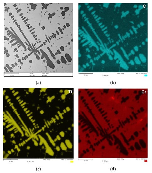 (a) BSE SEM micrograph taken from the mid-section of TRC (Table 3) showing the primary TiC precipitates in dendritic form and eutectic plate-like TiC precipitates, and (b–d) corresponding maps of C, Ti, and Cr distribution, respectively.