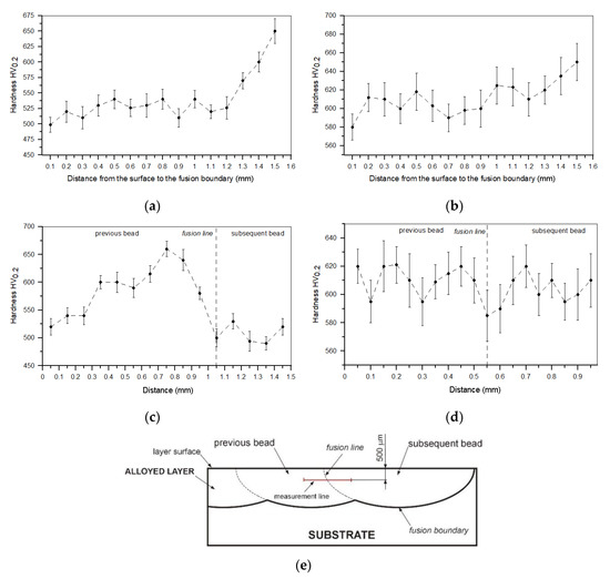 (a,b) Hardness depth profiles for TRC and TRM (Table 3), respectively. (c,d) Hardness profiles across the overlap boundary between consecutive beads in TRC and TRM, respectively. (e) Diagram showing a location of the measurement line in the overlap boundary.