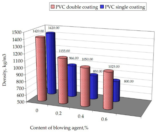 The single layered coatings made using a PVC with an exothermic blowing agent showed a density in the range of 966 kg/m3 (by 0.2% BA) to 800 kg/m3 (by 0.6% BA). The density of double layered coatings specimens changed from 1155 to 1025 kg/m3 at the blowing material amount from 0.2 to 0.6%, respectively. Cellular coating from PVC were characterized by porosity in the range of 32 to 40% and from 19 to 28% with BA content ranges 0.2–0.6%, respectively.