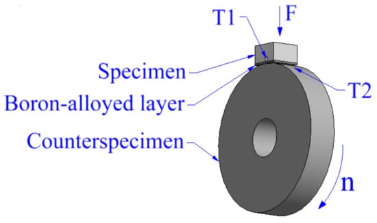 Specimens cut to dimensions suitable for the wear tester were mounted in it in a way presented in Figure 2. Machine used for the testing was AMSLER A135 (Amsler, Szafuza, Switzerland) which allows to set specific load to the specimen and specific rotational speed to the counterspecimen. Dimensions of the counterspecimen were 45 mm in diameter and thickness equal to 12 mm, with mounting hole of diameter equal to 15 mm. In this study load was equal to F = 392 N and rotational speed of the counterspecimen n = 180 rev./min, just like at paper []. Some droplets of water were delivered to the friction zone to make the friction coefficient lower. During the process, two temperatures (T1 and T2) were measured using thermometer TES-1312A (TES, Taipei, Taiwan) with probe equipped with thermocouple type “K”—NiCr-NiAl. Places of these measurements are presented in Figure 2. Measurements of temperature T1 were taken from inside the sample through a drilled hole and temperature T2 was measured on surfaces of counterspecimens, just behind the friction zone. Moreover, frictional moments were measured for each specimen during the process. Testing time of boron-alloyed specimens was equal to t = 45 min. The wear test of sample made from Monel 400 was stopped after 5 min due to the fact that the specimen suffered notable seizing and large increases in temperatures T1 and T2 was observed.