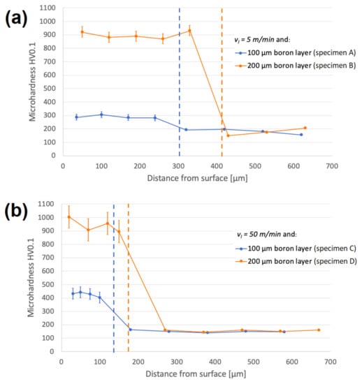 Microhardness of borided layers in different distances from surface, alloyed with: (a) vl = 5 m/min and (b) vl = 50 m/min.