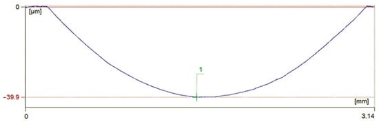For quantitative comparison of wear resistance of laser borided Monel 400 surfaces, two indicators were taken into consideration: depth of the friction zone and mass loss of each specimen after the wear test. In Figure 6, an exemplary measurement of depth of friction zone is shown. This specific profile was measured on sample borided with 100 µm boron paste using laser beam scanning velocity equal to 50 m/min. Figure 7 is a graphic representation of values of friction zones’ depths and mass losses after the wear test.