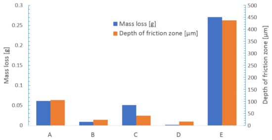 For measuring depth of friction zone, contact profilometer ZEISS (Carl Zeiss, Oberkochen, Germany) was used. It was equipped with induction converter and SUFORM software version 2.0 provided by SAJD Metrologia company (SAJD, Kielce, Poland). Measuring the mass loss of specimens after the wear test was performed with laboratory weight Sartorius BP221S (PCE-instruments, Southampton, Hampshire, UK) with a precision of 0.0001 g.