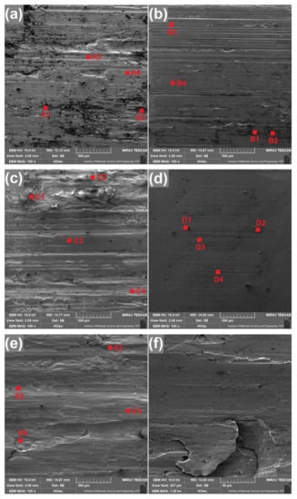 Surfaces after the wear test of specimens produced with: (a) vl = 5 m/min and tb = 100 µm, (b) vl = 5 m/min and tb = 200 µm, (c) vl = 50 m/min and tb = 100 µm, (d) vl = 50 m/min and tb = 200 µm, (e),(f) untreated Monel 400.