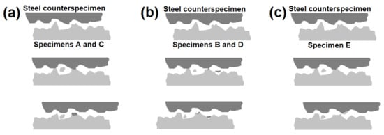Schemes of wear mechanisms on different specimens: (a) Specimens A and C: serious abrasive wear of the specimen and adhesive wear of the counterspecimen, (b) Specimens B and D: minor abrasive wear of the specimen and adhesive wear of the counterspecimen, (c) Specimen E: serious abrasive and adhesive wear of the specimen, with plastic deformation.