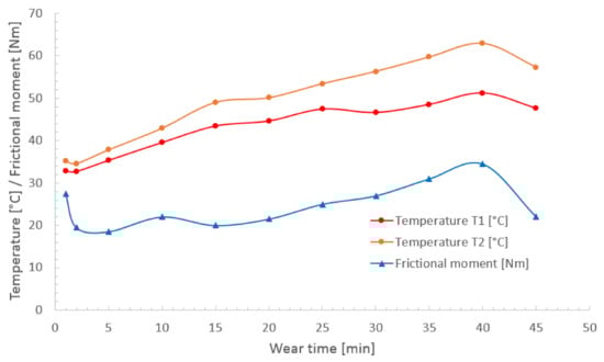 It is clearly seen in Figure 8b,d that specimens which were alloyed with boron paste 200 µm thick suffered minor wear in comparison with these described above. Both surfaces contain much fewer grooves and signs of plastic deformation. Surface presented in Figure 8b is mostly covered with scratches of various widths but there are considerably fewer deformed areas than on surfaces alloyed with 100 µm boron paste. Despite this, iron particles were detected on this surface as well but in a smaller amount which can be seen in Figure 8b and in results from spots marked as B1 and B2. These results lead to the conclusion that in this case the major mechanism of wear was abrasive. However, presence of iron built-ups detected during analysis of chemical composition suggests that slight adhesive wear also occurred in some areas. Moreover, an exemplary graph of frictional moment and temperatures during the wear test of specimen laser alloyed with 200 µm boron paste and laser beam scanning velocity equal to 5 m/min (Figure 11) indicates irregular movement resistance. On the other hand, a specimen produced with the same amount of boron but higher laser beam scanning velocity which surface is presented in Figure 8d. This suffered only insignificant wear in comparison with other samples. Scratches visible after the wear test are shallow and narrow, and there are no signs of plastic deformation of alloyed layer. Foreign particles are visible but only as spots (not surfaces like on other specimens) and in small amount. These spots of increased oxygen concentration are visible in Figure 9d, and results of their chemical composition analysis are shown in Table 4 as D1 and D2. This suggests that laser alloyed layer with the highest microhardness suffered only minor abrasive wear, with insignificant share of adhesive wear and oxidation. The scheme of this wear mechanism is shown in Figure 10b.
