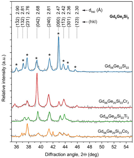 The investigation of microstructure performed with the help of X-ray diffractometer for the Gd58-xGe20Si22Yx (x = 0 or 2; Y = Co, Ti or Cr) alloys after isothermal annealing at 1450 K for 2 h is presented in Figure 1. It can be seen that diffraction pattern recorded for diffraction angle 2Θ = 35–55° for all investigated materials shows the presence of peaks, which can be assigned to the required high magnetocaloric Gd5Ge2Si2-type phase. The changes in the intensity of peaks between investigated samples reflect additions of Co, Ti and Cr to master Gd58Ge20Si22 alloy and texture of the examined materials. It is particularly evident for the reflex described by d-spacing in Bragg’s law equals to dhkl = 2.68 Å for the (0 4 2) plane (PDF cards: 04-008-5158 or 01-073-3500).