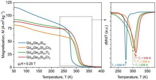 The Curie point (TC) for all analyzed samples calculated as a temperature, which corresponds to the minimum value of the derivative dM/dT, is presented in Figure 3 (right side). The recorded M(T) thermomagnetic characteristics are typical for ferromagnetic materials with first (FOPT) and second (SOPT) order phase transition. The Gd58Ge20Si22 sample shows the lower Curie point (TC = 268 K) in comparison to sample with the addition of Co, Ti and Cr (304 K, 298 K and 308 K, respectively). The addition 2 at.% of Co, Ti or Cr to master GdGeSi alloy leads to an increase of the Curie point, which is important from the application point of view. On the other hand, the magnetic magnetization measured at the same temperature in the ferromagnetic region (50–250 K) varies with the chemical composition of produced materials. The Gd58Ge20Si22 sample exhibits higher magnetization than samples with additives (Figure 3). Moreover, the reference GdGeSi sample shows FOTP [16], whereas Co-, Ti and Cr-containing materials present ferromagnetic to paramagnetic phase transition described as SOPT. It is worth noting that the smallest value of M in the temperature range 50–250 K for all investigated samples was observed for the Co-containing sample despite the highest magnetic moment.