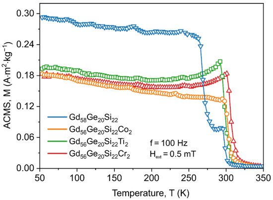 Magnetic magnetization versus temperature curves for the Gd58Ge20Si22, Gd56Ge20Si22Co2, Gd56Ge20Si22Ti2 and Gd56Ge20Si22Cr2 alloys annealed at 1450 K for 2 h recorded at external DC magnetic field of 0.25 T.