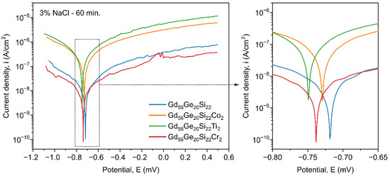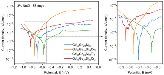 Due to the good corrosion resistance of Co, Ti and Cr, the influence of these additives on the corrosion behavior of the Gd58-xGe20Si22Yx (x = 0 or 2; Y = Co, Ti or Cr) alloys was investigated. From an application point of view, the corrosion resistance of the investigated magnetocaloric materials is significant because these alloys usually work in chloride-containing water used as a cooling medium in environmentally friendly refrigeration. All investigations of electrochemical properties presented below were performed for the Co-, Ti- and Cr-containing samples in relation to the Gd58Ge20Si22 as the reference sample. Figure 6 and Figure 7 present the corrosion properties of the investigated alloys after 60 min. and 55 days exposition in 3% NaCl solution, respectively. Figure 6 shows that for the Gd58Ge20Si22 sample and with the addition of Co, Ti and Cr, even for a short exposure time (60 min. in 3% NaCl solution), differences in the rates of the electrode processes proceeding on the metallic surface were registered.