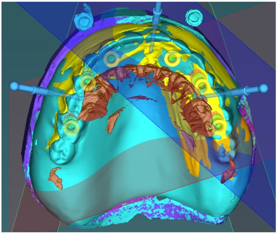 All surgical guides used in the present study were designed by the same surgeon (M.K.), who supervised all surgical procedures in both study groups. Surgical planning was carried out using coDiagnostiX software, version 10.2 (Dental Wings, Montreal, CA, USA). The STL file of the study cast with the gutta-percha markers in place was registered with the Digital Imaging and Communications in Medicine (DICOM) data of the preoperative CBCT reconstruction by surface registration. The STL file of the study cast of the edentulous jaw without the gutta-percha markers and the study cast with the diagnostic wax-up were registered with the STL file of the study cast with the gutta-percha markers in place. In the present study, implant-borne overdentures anchored and supported by 2–4 implants or fixed prostheses supported by 4–6 implants were planned on the edentulous jaws. Prosthetically ideal implant positions were determined and a surgical guide for half-guided implant placement was designed with 2-mm-diameter sleeves (Article number HN001, Hager & Meisinger GmbH, Neuss, Germany) to guide the pilot drill (Article number HN011, Hager & Meisinger GmbH, Neuss, Germany) and 3 template fixation pins (Straumann Template Fixation Pin, Article number 034.282, Straumann GMBH, Basel, Switzerland) were planned to keep the surgical guide in place. All surgical guides were manufactured by stereolithography and sterilized prior to surgery. Figure 1 presents the planning of one of the cases.