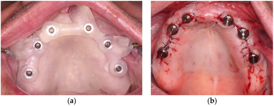 Patients rinsed with 0.2% chlorhexidine solution for 1 min before surgery. Under local anesthesia, the surgical guide was fixed using template fixation pins (Straumann Template Fixation Pin, Article number 034.282, Straumann GMBH, Basel, Switzerland). Pilot osteotomies were carried out using a pilot drill 2 mm in diameter (Article number HN011, Hager & Meisinger GmbH, Neuss, Germany). The fixation pins and the surgical guide were removed and a full-thickness flap was elevated from a crestal incision. Implant osteotomies were finalized according to the implant manufacturer’s instructions. In the case of 3.8-mm-diameter implants, a single 3.5-mm-diameter tapered drill specific to the length of the implant was used. In the case of 4.3 mm implants, in addition to the 3.5-mm-diameter drill, a 4.1-mm-diameter tapered drill specific to the length of the implant was used to finalize the osteotomies, with external cooling at a drill rotation speed of 800 rpm. Additional bone tapping was carried out in dense bone. Dental implants (Denti Root Form Plus, Denti-Systems Ltd., Szentes, Hungary) were placed non-submerged. Wound margins were stabilized with single interrupted sutures. Antibiotics (1 g amoxicillin-clavulanate twice a day for 5 days or, in case of side effects or known allergy to penicillin, 300 mg clindamycin 4 times a day for 4 days), non-steroid anti-inflammatory drugs (50 mg diclofenac 3 times a day for 3 days) and chlorhexidine mouthwash (twice a day for 14 days) were prescribed. Sutures were removed after 7 days. The base of preexisting dentures was modified to accommodate the healing abutments during the 3-month healing period. Figure 2 presents the surgical intervention.
