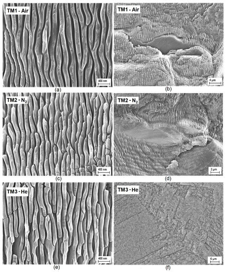 - Rebollar, E.; Vázquez de Aldana, J.R.; Martín-Fabiani, I.; Hernández, M.; Rueda, D.R.; Ezquerra, T.A.; Domingo, C.; Moreno, P.; Castillejo, M. Assessment of femtosecond laser induced periodic surface structures on polymer films. Phys. Chem. Chem. Phys. 2013, 15, 11287–11298. [Google Scholar] [CrossRef]