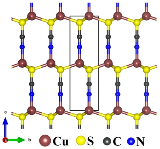CuSCN crystallises in two polymorphic forms, α-CuSCN (orthorhombic crystal lattice) and the β-CuSCN (hexagonal crystal structure) [53]. In the more stable β-CuSCN structure (Figure 1), the plains of Cu atoms are separated by layers of SCN ions, three-dimensionally interconnected by strong Cu–S bonds. As shown in Table 1, the lattice parameters of β-CuSCN are predicted at a = b = 3.828 Å and c = 10.970 Å, in close agreement with experimental data (a = b = 3.850 Å and c = 10.938 Å) [51] and previous DFT calculation results [36,54,55]. The average Cu–N, Cu–S, C–S, and C–N bond distances are calculated at 1.887, 2.316, 1.175, and 1.660 Å, respectively. The α(CuSC) and α(CuSCu) bond angles are predicted at 109.2° and 109.7°, respectively.