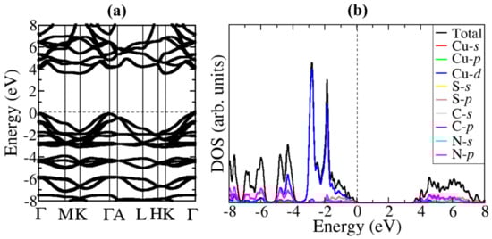 Figure 2. (a) Electronic band structure and (b) projected electronic density of states (PDOS) of hexagonal β-CuSCN.