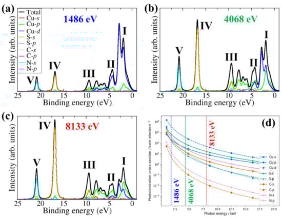 Figure 3. DFT-simulated XPS valence band spectra of hexagonal β-CuSCN obtained at (a) 1.486 keV (Al Kα1), (b) 4.068 keV, and (c) 8.133 keV ionizing photon energy. The dependence of the photoionisation cross-section on the ionising photon energy for the atomic orbitals is shown in (d).