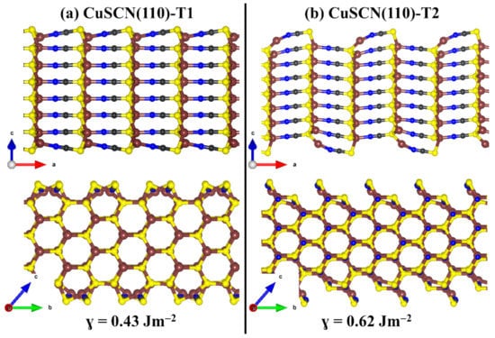 Here, we have characterised the structure, composition, relative stabilities, and work function of the two most stable β-CuSCN (100) and (110) surfaces. Both surfaces have two non-dipolar terminations (denoted as termination T1 and T2), both of which are characterised to determine the most stable one. Shown in Figure 4 and Figure 5 are the relaxed structures of the two terminations of the (100) and (110) β-CuSCN surfaces. Termination T1 (T2) of the (100) surface has a calculated surface energy of 0.57 (0.76 Jm−2), indicating that the termination T1 is more stable than termination T2. Similarly, we predict the surface energy of T1 (T2) of the (110) surface to be 0.43 (0.62 Jm−2). Similarly, results were reported by Chen et al. [54], who reported surface energy of 0.74 and 0.63 Jm−2 for the most stable terminations of the (110) and (100) surfaces, respectively.