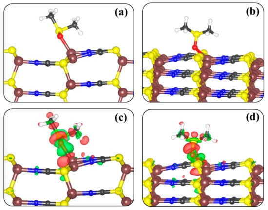 The adsorption of the DMSO on the (100) and (110) surfaces is demonstrated to be characterised by redistribution of charge density in the surface-DMSO systems, as obtained from analysis of the differential charge density ( ρ ) iso-surface contours (Figure 6c,d). ρ = ρ s u r f + D M S O ρ s u r f + ρ D M S O , where ρ s u r f + D M S O ,   ρ s u r f , and ρ D M S O are the charge density of the total surf-DMSO complex, the naked β-CuSCN surface, and the free DMSO molecule as in the relaxed adsorbed configuration. We observe charge density accumulation between the Cu–O bonds, suggesting chemisorption. Bader charge analyses reveal that the net charge transfer from the β-CuSCN surfaces to the DMSO molecule is minimal, calculated to be 0.08 and 0.05 e at the (100) and (110) surfaces, respectively (Table 3). Owing to the small charge transfer to the DMSO molecule upon adsorption, the interatomic bond distances and angles changed marginally, relative to the gas-phase parameters.