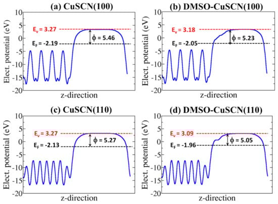 Figure 7. The averaged electrostatic potentials for (a) naked CuSCN (100), (b) DMSO-covered CuSCN (100), (c) naked CuSCN (110), and (d) DMSO-covered CuSCN (110) surfaces. Red dashed line = vacuum level (Evac), black dashed line = Fermi level (EF), and Φ = work function.