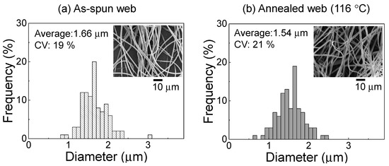 The fiber diameter distributions of the PET web samples before and after annealing at 116 °C are shown in Figure 2 along with the corresponding SEM images. The average and CV values obtained from the diameter distribution are also shown. We proved that the PET web with ultra-fine fibers and fairly uniform fiber diameter (average fiber diameter of 1.66 μm and a CV of 19%) was obtained by the LES process. There was no practical change in fiber diameter after annealing at 116 °C, indicating that the length of the fibers in the web did not change during the annealing process because of the fixation of the web size.
