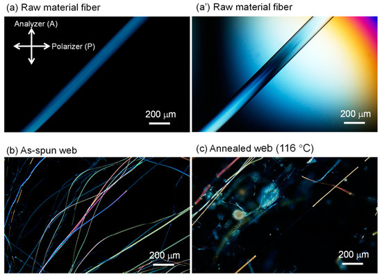Figure 3. Micrographs observed under a polarizing microscope with cross-polarization for the (a), (a’) raw material fiber (melt-spun fiber supplied for LES), (b) as-spun web, and (c) web after annealing at 116 °C for 5 min. The directions of polarization for a polarizer and an analyzer are indicated in the figure. A Berek compensator was inserted in (a’).