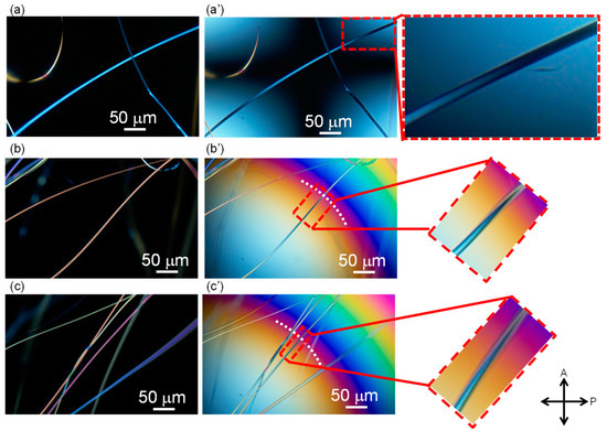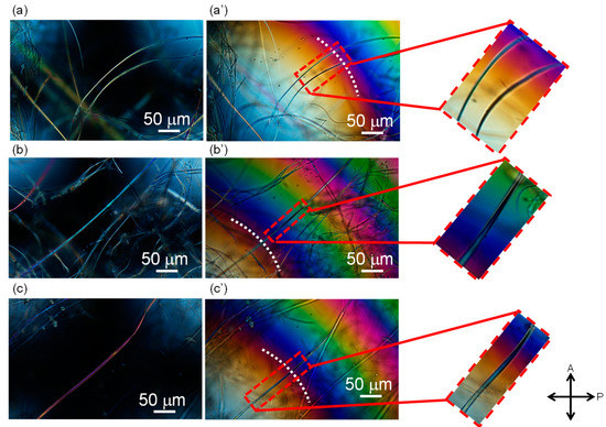 Figure 5. Typical examples of fibers in the web after annealing at 116 °C for 5 min, observed under a polarizing microscope with the insertion of a Berek compensator and (ac) no addition of retardation at the center of the image and (a’c’) a position with the addition of retardation of approximately 550 nm is indicated with a white dotted line.