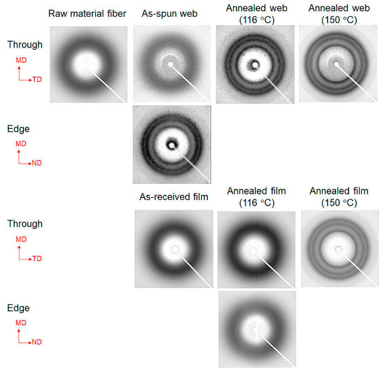 The WAXD patterns obtained from the through- and edge-directions of the web and film samples of PET are shown in Figure 6. In this figure, the MD, TD, and ND correspond to the winding/machine direction, transverse direction, and normal direction, respectively. The WAXD intensity profiles of the web and film samples obtained by averaging the intensity along the azimuthal direction from 0° to 180° are shown in Figure 7. The intensity peaks at approximately 2θ = 17°, 23°, and 26° correspond to the ( 0 1 ¯ 1 )/(010), ( 1 ¯ 10 ), and (100) reflections, respectively [18]. The appearance of only an amorphous halo was confirmed for all the samples (as-received film, raw material fiber for LES, and as-spun web) before annealing. After annealing at 116 °C for 5 min, the film samples did not exhibit crystalline reflections, whereas distinct crystalline reflections were observed for the annealed web samples. At an annealing temperature of 150 °C, the appearance of crystalline reflections was confirmed for both the film and fiber samples.