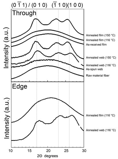 These results suggest that the annealing period of 5 min at 116 °C was not sufficient for the crystallization of the film with virtually no orientation, while the web sample could crystallize under these conditions because a certain degree of orientation was imposed during LES. Therefore, after annealing at 116 °C, the crystallinity of the film was approximately 5%, while that of the web samples was approximately 29%, as shown in Figure 10. After annealing at 150 °C, both the web and film samples showed a crystallinity of approximately 29%.