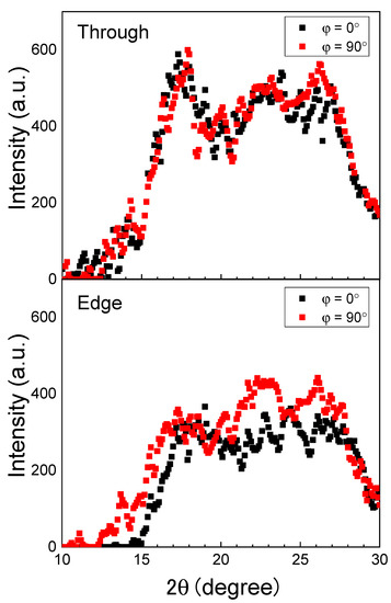 For the web sample annealed at 116 °C, intensity profiles at azimuthal angles of 0° and 90° were prepared from the results of the through- and edge-direction WAXD measurements. As can be seen in Figure 8, the crystalline peak intensities were slightly stronger at 90° than at 0° for the edge-view measurement, although no clear difference was found for the through-view measurement. This result suggests the existence of a certain degree of c-axis orientation of the crystals in the web fibers, where the fibers were aligned parallel to the web surface.