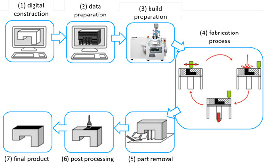 For selective laser melting we employed a Realizer SLM 50 (Realizer GmbH, Borchen, Germany) equipped with a W yttrium fiber laser (IPG, YLM-100). The spot size of the laser was set to μm at focus position. The machine processes under an argon atmosphere with a 0.1% oxygen level. The platform was kept at °C to maintain the machined part at an elevated temperature to avoid deformation by curling due to residual stress. In Figure 1 the physical process chain in selective laser melting is shown. The physical process chain consists of the following steps: (1) digital construction of the part, (2) data preparation for processing in additive manufacturing—e.g., defining the build orientation and support structures, (3) preparation of the AM system, (4) AM fabrication process, (5) part removal from the AM system—e.g., part cutting from the build plate and thermal treatment, (6) post-processing of the surface—e.g., blasting and (7) final product ready for application [34,35,36].