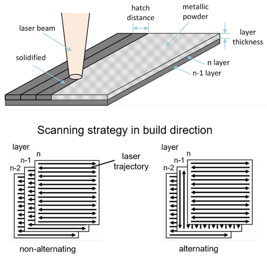 The laser processing of the metallic powder is schematically shown in Figure 2 (top). To solidify the powder, the laser scans on linear trajectories spaced by the hatch distance across the powder bed. The process is finished by scanning a contour line around the processed area. The scanning strategy for the hatch can be varied in build direction. In Figure 2 (below), non-alternating and alternating scanning strategies are illustrated. Using a non-alternating scanning strategy, the hatch trajectory in each layer remains constant. In contrast, applying an alternating scanning strategy, the hatch trajectory is rotated by in each layer. The surface quality, i.e., the surface roughness and scalloping of the surface, can be influenced by the applied scanning strategy.