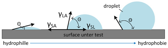 The wetting behavior of technical surfaces can be characterized by the contact angle of a droplet [42]. The method of Young [43] used for smooth surfaces is shown on Figure 3.