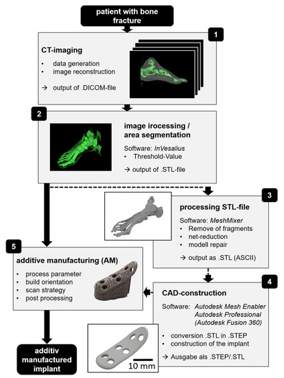 In additive manufacturing systems, the standard input data are obtained from an .stl file, describing the surface of the part by small triangles. The .stl-file is generated by the CAM system after digital construction of the part or by 3D scanning of the surface of an existing part. For designing an individual implant, an adaption of the geometry of the implant to the bone is needed. The digital process chain of the fabrication of an individual implant is shown in Figure 4. The original data were obtained by CT-imaging of the human metatarsal area. The 3D image was obtained by a composition of sequential 2D images, available in the .DICOM data format (see point 1 in Figure 4). To obtain the surface data from the metatarsal bone, we have to combine the sectional images from the CT to a 3D image and to separate the human tissue from the bone. The image processing and area segmentation were done by the software InVesalius and resulted in a surface model of the metatarsal bone represented by an .stl file (see point 2 in Figure 4). We used the Hounsfield scale (HU) to separate the bone form tissue with a specific threshold [44]. Standard-values of the Hounsfield scale, are e.g., 0 HU for water and 350 to 2000 HU for bones (cortical). The software system In Veaslius was used for separation and identification of the bone areas and to convert the CT sectional imaging into a .stl data format.