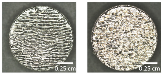 As osteosythesis plates are supposed to be removed after a certain healing period, the surface properties resulting from the SLM process that are assertive for the engraftment of tissue were studied. Therefore, different surface textures were produced by SLM processing. Initially, we analyzed a layer-wise alternating scanning strategy of and a non-alternating () scanning strategy. Using a not-alternating (na) scan-strategy, periodic groves on the top surface appear, whereas an alternating scanning strategy of leads to a stochastic surface profile. In Figure 6, microscopic images of both surface structures are shown.